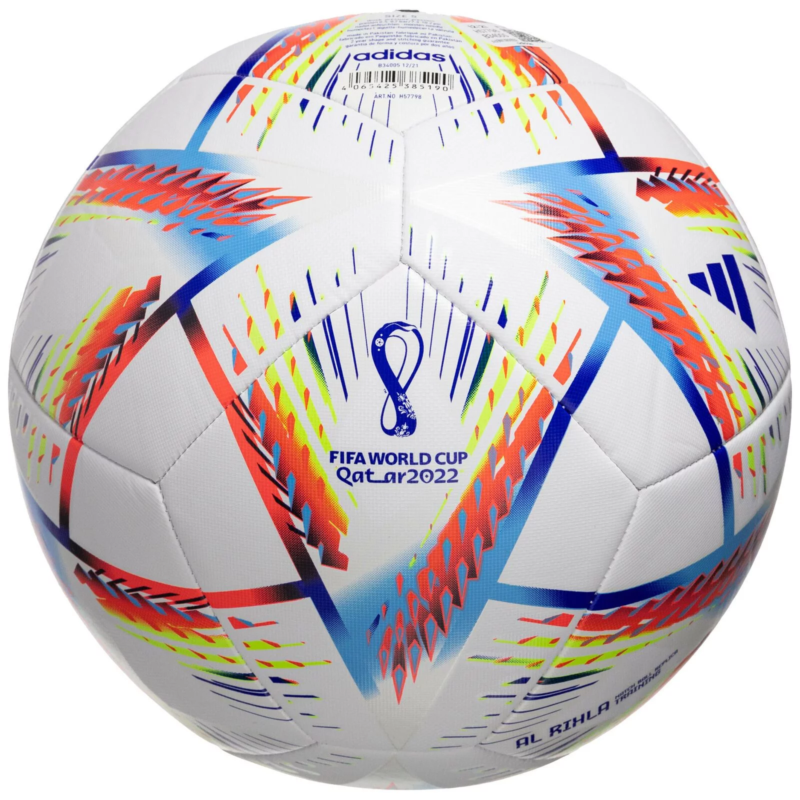 Футбольний м'яч 'Adidas 2022 World Cup Al Rihla Training H57798. Тренувальний м'яч Al Rihla від Adidas виглядає так само, як модель, яка котитиметься по полю на Чемпіонаті світу з футболу 2022 року в Катарі.