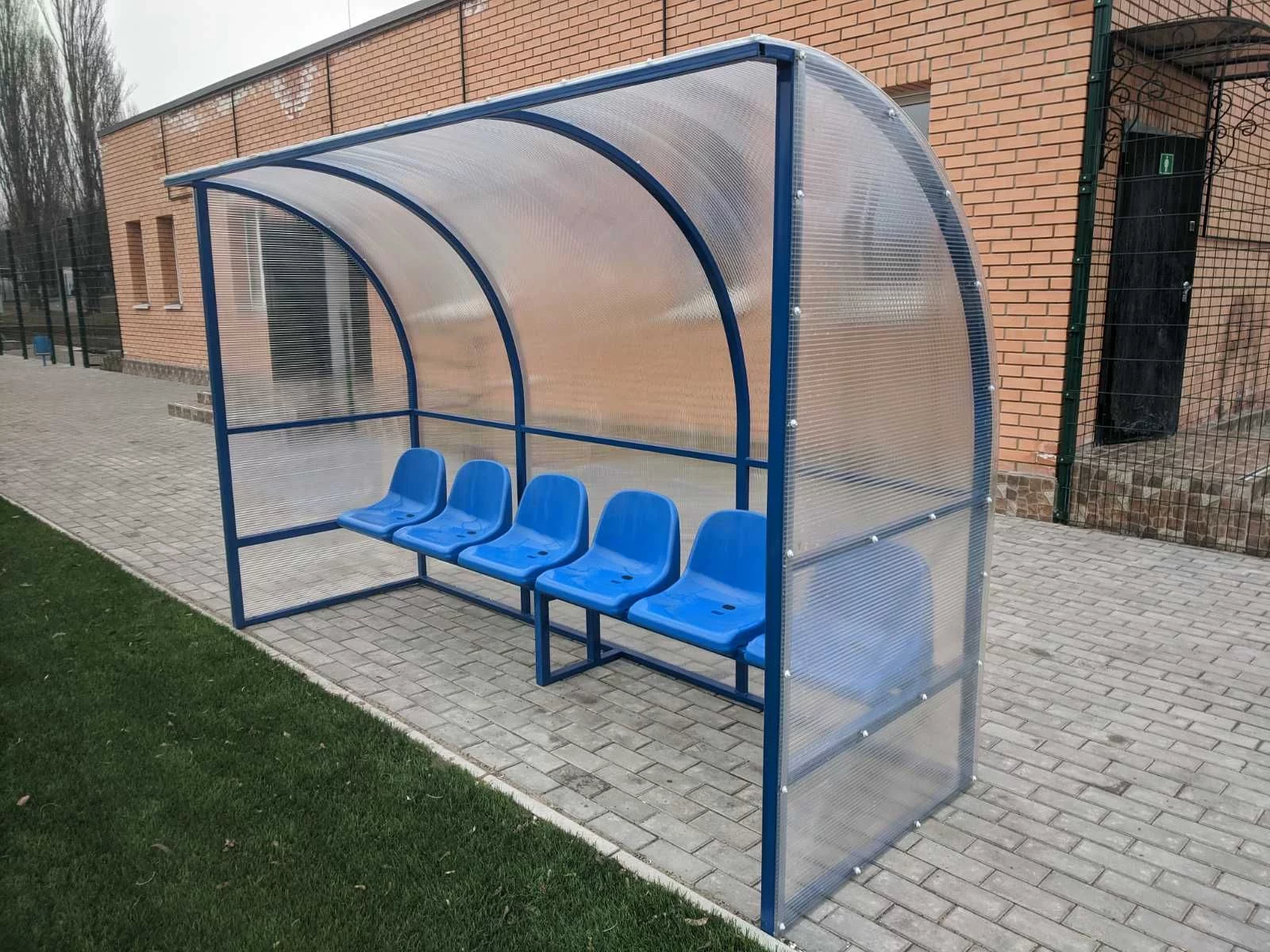 Кабінка для запасних гравців під час ігор у футбол на 6 місць, з дахом, який закриває відпочивальників від сонця і дощу та бічними стінками, які захищають від вітру.