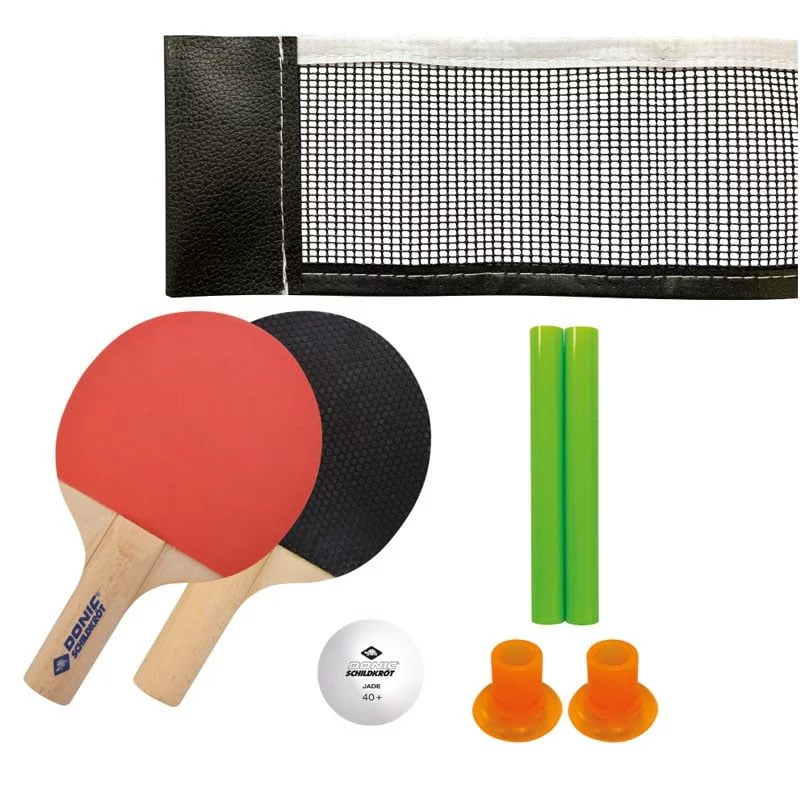 Міні-набір для настільного тенісу від Donic-Schildkröt — це гнучка розвага для настільного тенісу для молодих і старих і майже всюди. Просто прикріпіть невеликий набір сіток (57x7.5 см) до гладкого столу за допомогою присосок (в ідеалі злегка змочіть присоску, тоді сітка буде триматися навіть на злегка текстурованих столах) і ви можете швидко змагатися під час обіду. перерва або між уроками в школі.
