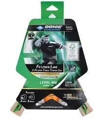 2 ракетки Fetzner 400 (губка 1,6 мм, нефритова гума ITTF, увігнута ручка, сертифіковане FSC дерево), 3 м’ячі Poly 40+ (2 білі / 1 помаранчевий), в новій картонній упаковці