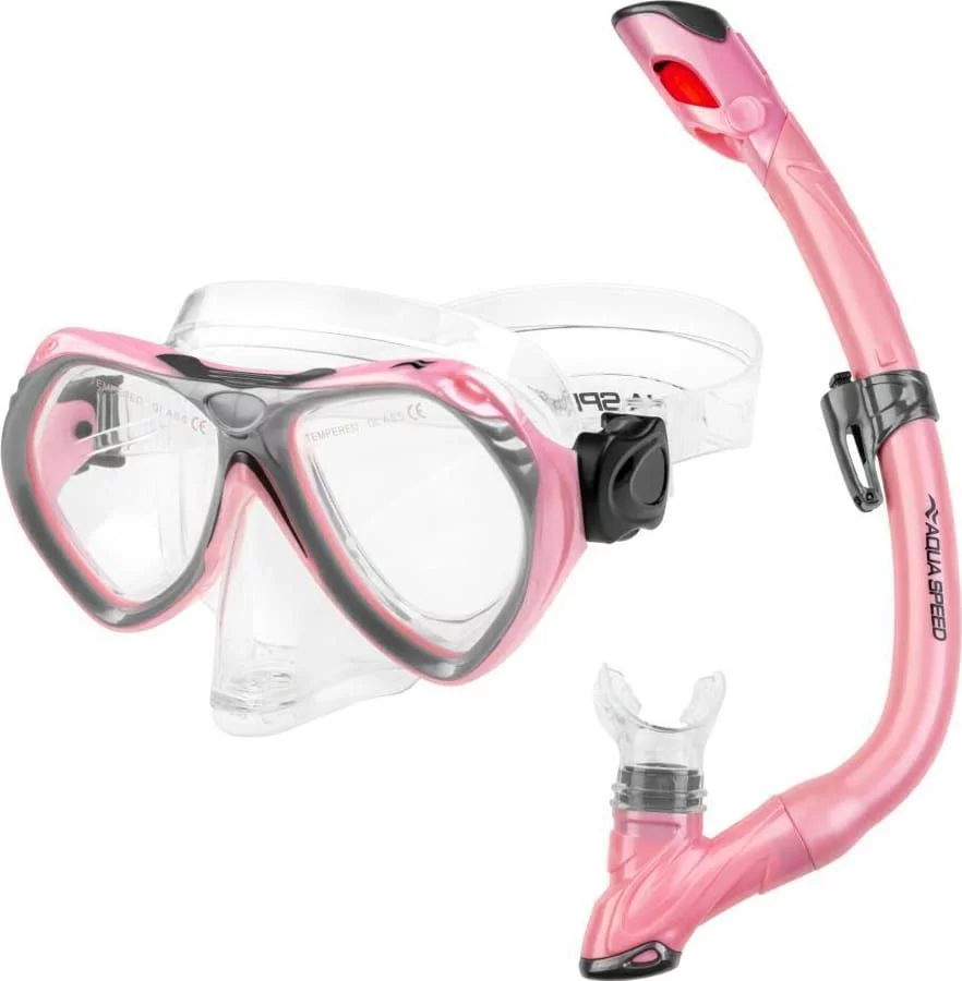 Набір маска і трубка Aqua Speed AURA + EVO Дитячий набір для підводного плавання AURA+EVO – чудовий вибір для юних любителів підводних пригод та чудовий подарунок на свята. Набір складається з наступних елементів: Дитяча маска для підводного плавання AURA класичної форми з розділеною лінзою. Компактний дизайн робить її ідеальною для дитячого обличчя. Комір та ремінець маски AURA виготовлені з силікону. Лінзи виготовлені з загартованого скла. Клапан, розташований у носовій частині маски, дозволяє здувати воду з маски навіть під час занурення. Маска оснащена легкою системою регулювання ремінця EASY-ADJUST. Дитяча маска для підводного плавання, оснащена нижнім клапаном та другим – верхнім, що запобігає затопленню трубки (система ULTRA DRY). Верхня частина трубки яскравого кольору дозволяє краще бачити дайвера у воді. Вигнутий мундштук анатомічної форми, спрямований до рота дайвера, виготовлений з міцного, неалергенного силікону. Широкий еліптичний поперечний переріз трубки сприяє повітрообміну.