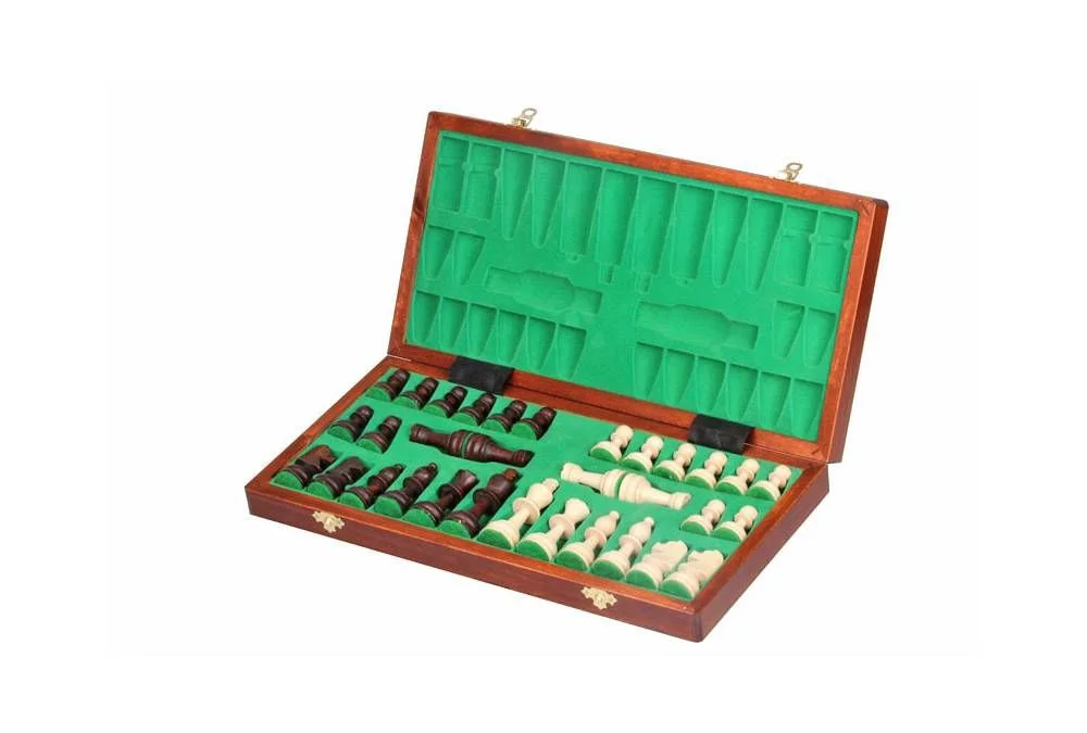 Дошка інтарсія виготовляється з натурального дерева, що забезпечує міцність і довгий термін служби, а дизайн шахових фігур Стаунтон, який був запропонований в середині XIX столітті, вважається стандартом і понині, і підкреслює особливу витонченість комплекту. Комплект включає 32 шахові фігури та 1 складану шахівницю. Загальний розмір складає 40,5 см х 40,5 см, ігрове поле - 33 см х 33 см, розмір клітини - 40 мм. Висота короля становить 85 мм, а висота пішака - 40 мм.