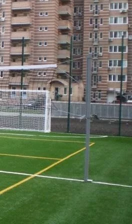 Для кріплення сітки передбачені спеціальні гачки. Сітка кріпиться за допомогою гачків до траверсу стійок і тримається за трос, протягнутий між стійками. На стійки наноситься полімерно-порошкове покриття: