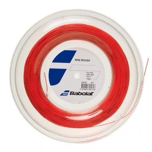 Бобина Babolat RPM rough red fluo 1,25mm 200m - це більш жорстка версія RPM Blast для збільшення показника обертання. Струна демонструє максимальне обертання завдяки восьмикутній формі, жорсткішій текстурі та силіконовому покриттю з поперечними зв'язками. RPM Rough чудово підходить для гравців із агресивним стилем, які люблять атакувати м'яч довгими швидкими ударами. Вона є трохи м'якшою і потужнішою за оригінальну RPM Blast, що призводить до трохи більш проникаючих ударів. З його чіпкою поверхнею ви зможете легко збити м'яч за допомогою обертання. Довговічність також досить висока, що робить струну чудовим варіантом для будь-якого гравця.