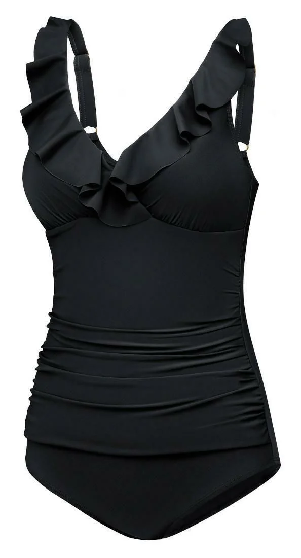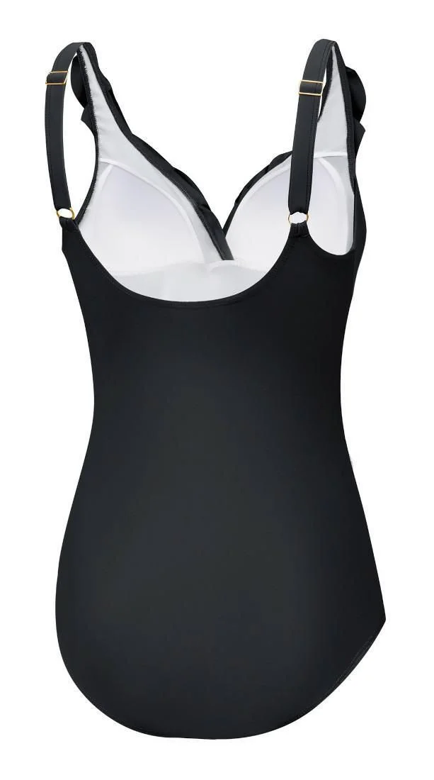 Відкрийте для себе надзвичайну елегантність і вишуканий стиль із нашим суцільним жіночим купальником із витонченою оборкою на декольте. Цей унікальний дизайн поєднує в собі класичні та сучасні елементи, забезпечуючи вам відчуття впевненості та приголомшливості як на пляжі, так і біля басейну. Наш суцільний купальник має регульовані бретелі для ідеальної посадки, комфорту та підтримки грудей. Крім того, складки на животі створюють ефект схуднення, делікатно підкреслюючи переваги вашої фігури. Виготовлений з тканини VITA (78% перероблений поліамід, 28% еластан) Висока стійкість до хлору Вбудований бюстгальтер з м'якими поролоновими чашками Регульовані бретелі Передній драпірований матеріал для ефекту схуднення/формування Повне покриття спини Сітка для контролю живота спереду
