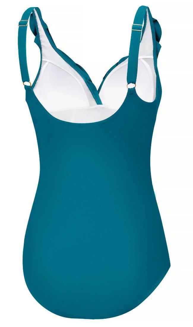 Купальник LYDIA Відкрийте для себе надзвичайну елегантність і вишуканий стиль із нашим суцільним жіночим купальником із витонченою оборкою на декольте. Цей унікальний дизайн поєднує в собі класичні та сучасні елементи, забезпечуючи вам відчуття впевненості та приголомшливості як на пляжі, так і біля басейну. Наш суцільний купальник має регульовані бретелі для ідеальної посадки, комфорту та підтримки грудей. Крім того, складки на животі створюють ефект схуднення, делікатно підкреслюючи переваги вашої фігури. Виготовлений з тканини VITA (78% перероблений поліамід, 28% еластан) Висока стійкість до хлору Вбудований бюстгальтер з м'якими поролоновими чашками Регульовані бретелі Передній драпірований матеріал для ефекту схуднення/формування Повне покриття спини Сітка для контролю живота спереду